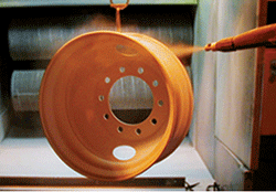 4) The Powder Coating is applied and magnetically attracted to the electrostatic rim.